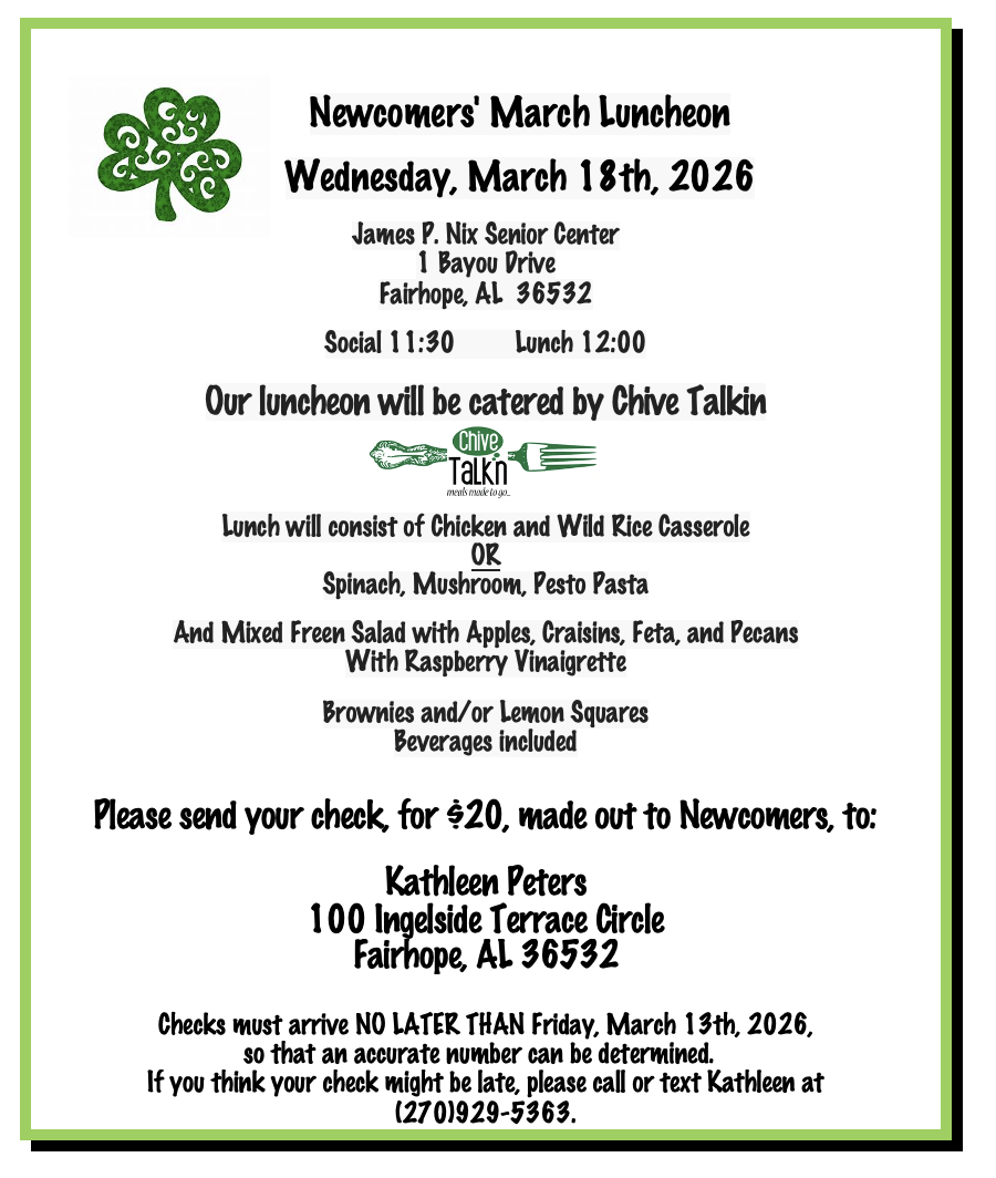 Dining Out Group 2 - Chair is Rose Anna Martin. Monthly RSVP requested for limited reservations. Check Event Calendar for details.